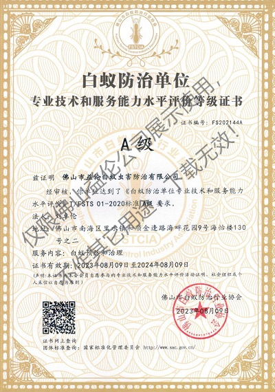 佛山白蚁防治资质A级证书(最高级)